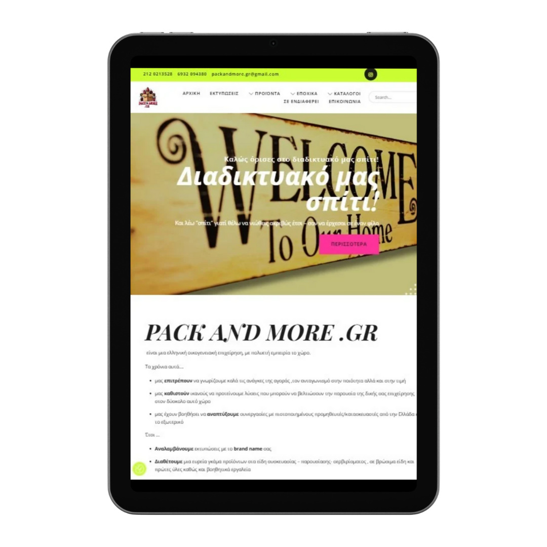 Η Pack & More χρειάστηκε μια σύγχρονη και λειτουργική ιστοσελίδα που να αναδεικνύει το πλήθος και την ποικιλία των προϊόντων της, ενώ ταυτόχρονα να είναι εύχρηστη για τον τελικό χρήστη. Στόχος ήταν η δημιουργία ενός ψηφιακού καταλόγου που διευκολύνει την αναζήτηση και την πλοήγηση, βελτιώνοντας την εμπειρία του πελάτη και ενισχύοντας την online παρουσία της εταιρείας.